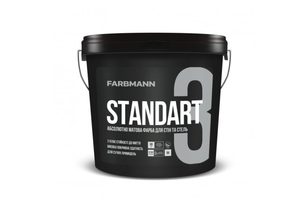 Матова латексна фарба для внутрішнього застосування FARBMANN STANDART 3 – це по-справжньому універсальний матеріал. Завдяки особливій системі загусників, фарба зручна в нанесенні, а оброблена поверхня стійка до миття, тому її можна застосовувати у сухих приміщеннях різного призначення: від невеликих офісів до масштабних промислових павільйонів і складських об’єктів. Крім цього, інтер’єрна фарба FARBMANN STANDART 3 екологічна та безпечна.